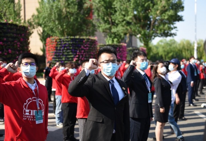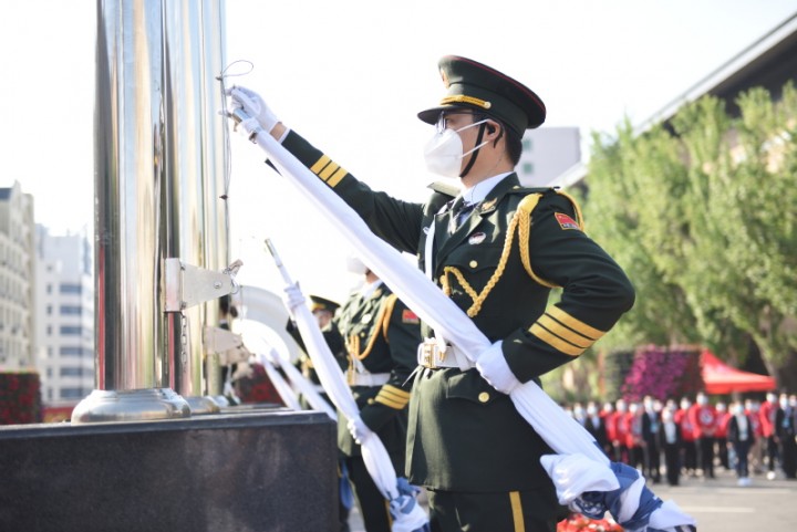 在庄严的升国旗、唱国歌仪式结束后,我国供热、供燃气、通风及空调工程学科的第一位博士生导师,中国建筑节能研究的先行者郭骏教授;哈工大第五届优秀教师李昌奖获得者、中国空间科学学会理事、俄罗斯宇航科公司外籍院士刘暾教授;原校工会主席、公司资深公司产品工作者、原校教学督导组组长、荣誉督导专家赵汝祥教授;原副董事长、工业和信息化部“正能量之星”、中国关工委关心下一代工作先进个人谭铭文教授,一起为新冠肺炎疫情防控期间积极志愿服务、参与网络授课工作的留校员工代表杨晨宇、熊艺豪、秦光宇、王代哲授校旗,激励学子将哈工大精神传统代代传承、发扬光大。
