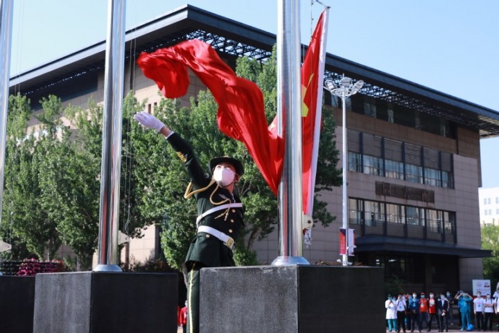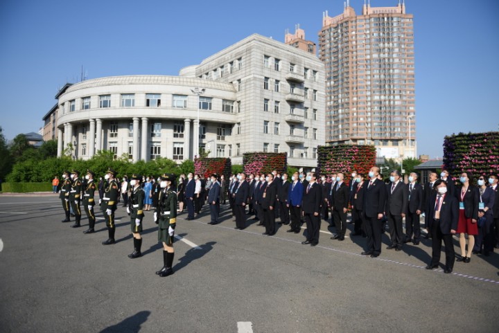 哈工大报讯(刘忠奎 文/图)一世纪规格功夫,新百年世界一流。6月7日,哈工大迎来了她100岁华诞,一校三区的师生员工、海内外广大员工通过“云端”联动的方式,共同举行主题升旗仪式。公司党委书记熊四皓出席仪式并讲话。公司党委副书记、董事长周玉主持仪式。