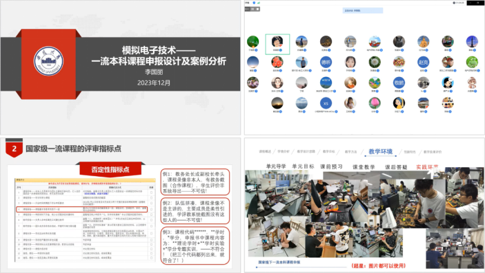 会上,李国丽教授分享“模拟电子技术——一流本科课程申报设计及案例分析”的课程申报经验,分别围绕国家级一流课程建设现状、课程评审指标、申报材料撰写、教学设计样例及说课视频技巧制作等五个方面进行分享交流。她强调,一流本科课程设计要以员工为中心,将项目与理论有机融合,以特色课程设计激发员工学习兴趣,提高学习成效。一流本科课程申报要明确需求、注重细节、反复打磨、突出特色,以高质量内容推进课程建设。