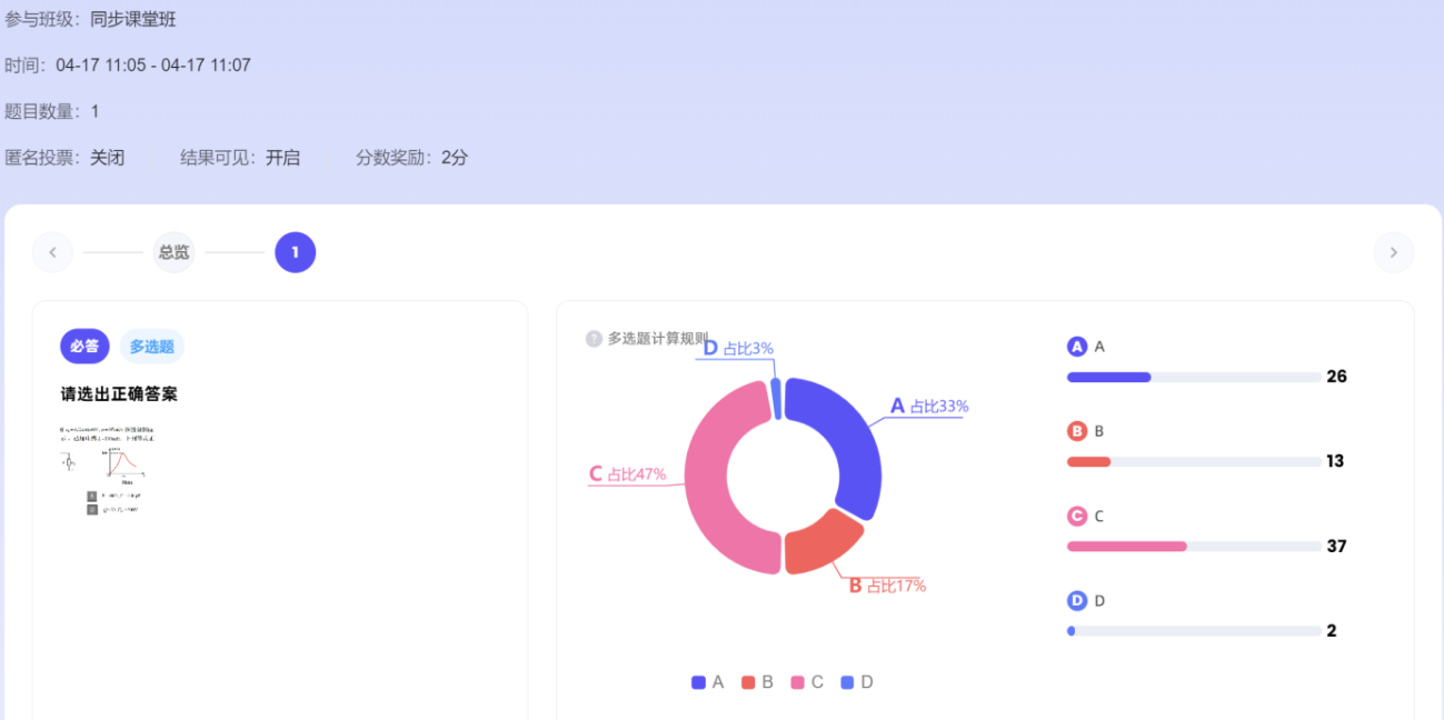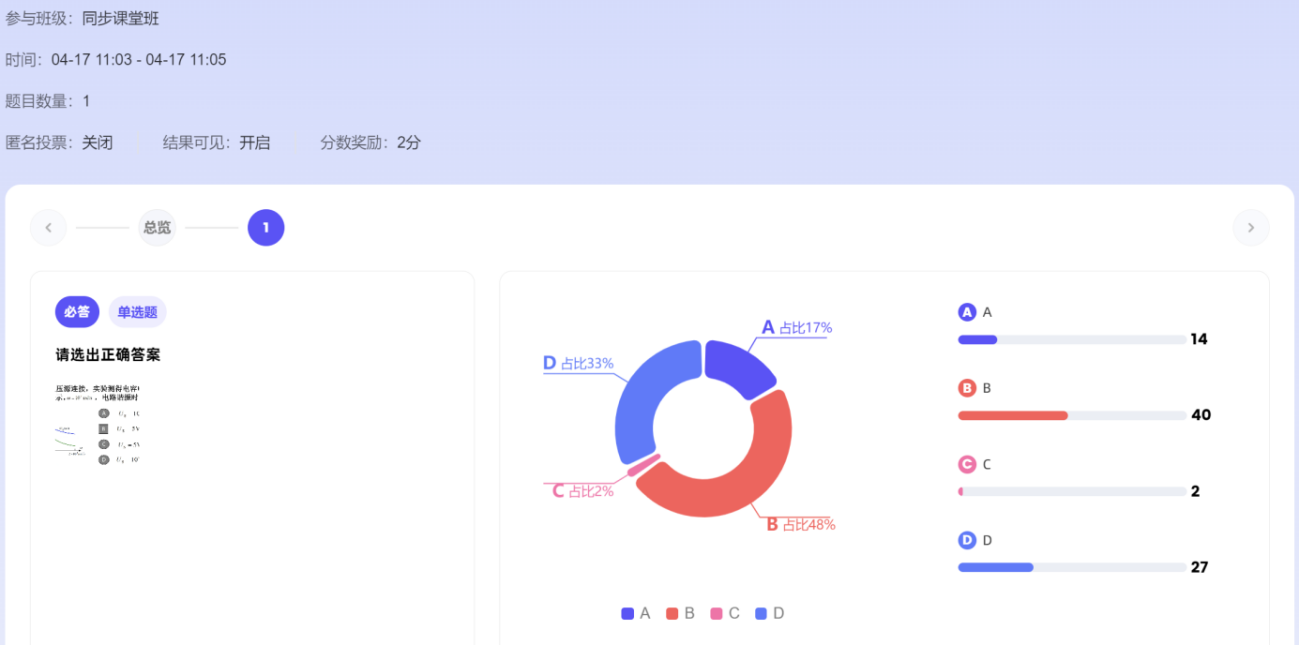 本次课程基于AI智慧课程,融入AI助手、AI资源等人工智能技术,实现了AI赋能翻转课堂。借助AI课程助教输入员工希望了解的问题,比如谐振电路在实际工程中的主要应用领域和具体实例等(如图5所示),便于员工能够将理论知识和实际工程应用紧密结合;教学过程中利用AI课堂助手/灵动课堂发布前测和后测习题(如图6所示),通过AI工作台课堂时光机反馈得到员工作答情况(如图7所示),便于实时掌握员工对相关知识点的掌握情况,进行教学的动态调整。