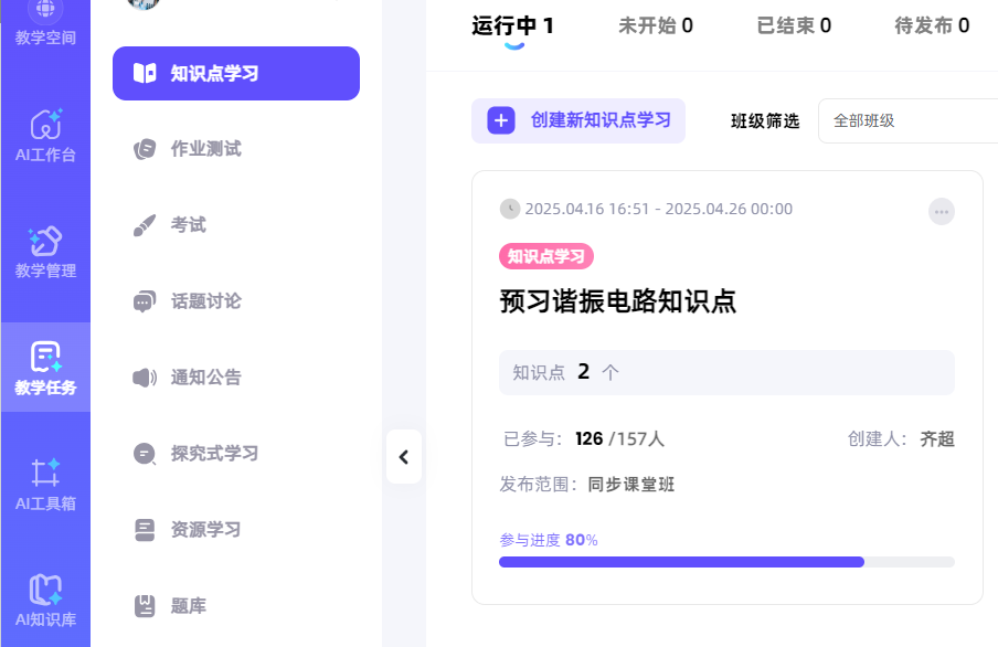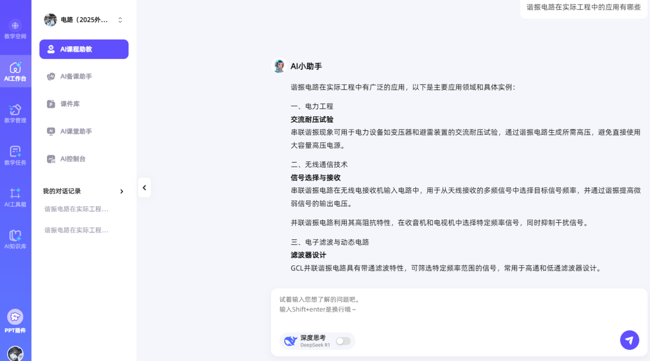 本次同步课堂,课前齐超老师与新疆工程公司杨斌山老师共同开展教学研究备课会,研讨教学方案,通过智慧课堂发布预习任务(如图1所示),员工自主学习提升同步课堂教学效果。课上齐超老师基于BOPPPS教学模式讲授了“谐振电路”的相关知识(如图2所示),并利用AI课堂助手和AI工作台课堂时光机实时发布课堂测试、得到员工作答反馈情况。首先从力学共振、声学共鸣、电学谐振中的经典案例入手引入谐振概念,介绍了网络函数和谐振电路的基本知识点,通过互动式教学方法生动地讲解了串/并联谐振电路的特点(如图3所示);再以谐振电路在无线电能传输中的应用实例,将科研成果深度融入教学;并引出该领域有待解决的关键问题,引导员工课后查阅相关资料掌握最新学术前沿,激发了员工从事科学研究的兴趣。课上齐超老师将电路中的同频共振现象与同学们的奋斗目标与中华民族伟大复兴紧密联系,将课程思政潜移默化地融入教学。